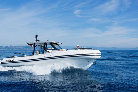 The largest boat ever built by Zodiac, the X10CC is THE boat for long, sunny days. Its generous deck space makes it easy to move around its equipment, whatever the number of passengers, which can be as many as 20. Its other assets? A double saloon that can be converted into a double sundeck, seating for between 10 and 13, a fully equipped kitchen, numerous easily accessible storage lockers and top-of-the-range features (folding seats, tinted portholes, topstitched upholstery, painted stainless steel, etc.). For those who don't want to go back to port, there's a cabin with a comfortable berth and bathroom...